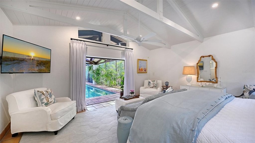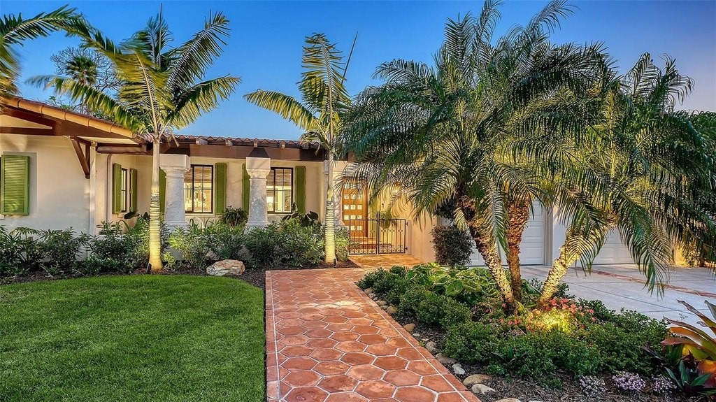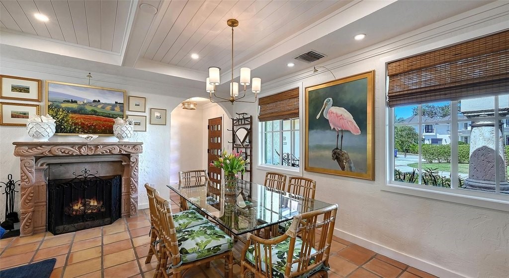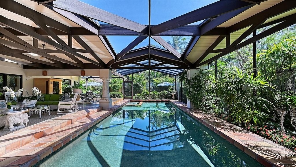Located in the sought-after West of Trail neighborhood of Oyster Bay Estates, this beautifully updated residence sits on nearly one-third of an acre just around the corner from the historic Field Club. The home blends timeless architectural character with extensive recent improvements, creating a refined yet relaxed retreat close to Sarasota's most desirable destinations. A beautifully landscaped yard and newly added covered front porch with brick pavers create inviting curb appeal and lead to a charming courtyard entry. Inside, the home showcases distinctive craftsmanship and warm architectural details, including Mexican tile floors, natural wood cabinetry and baseboards, exposed ceiling beams, plantation shutters, and hand-crafted clay sconces and pendant lighting. Fresh interior and exterior paint, updated trim, solid-core doors, and impact-rated windows and doors complement the home's original character while adding modern comfort. The main living spaces flow naturally together, with the kitchen, dining area, and living room opening through walls of glass to the expansive screened lanai. A wood-burning fireplace with carved stone mantel anchors the living room, while a newly detailed tray ceiling adds architectural interest. The kitchen combines artisanal style with high-end functionality, offering custom wood cabinetry, updated countertops, an intricate ceiling detail, and premium appliances including a Sub-Zero refrigerator and Fisher & Paykel dual-fuel range with side-by-side ovens. Privately positioned, the primary suite features vaulted ceilings with exposed wood beams and sliding glass pocket doors that open directly to the pool terrace. Two walk-in closets with newly designed systems lead to the renovated primary bath, which offers dual vanities, private water closets, and a spacious walk-in shower. Two generously sized guest bedrooms provide comfortable accommodations, each with built-in closet systems and beautifully renovated en-suite baths, creating privacy for family and guests within the home's traditional split floor plan. Outdoor living is designed for both relaxation and entertaining. The screened lanai surrounds a 40-by-14 heated pool framed by stone columns and generous covered seating areas with wood ceilings, while an Ipe wood open deck, fire pit, and lush tropical landscaping create a private backyard sanctuary. Additional improvements include updated plumbing and HVAC throughout, new ductwork and attic insulation, LED lighting, a Sonos sound system in the main living area and covered porch, renovated laundry room with new cabinetry and appliances, epoxy garage flooring, and a propane tankless water heater with gas supplied to the kitchen range and outdoor grill. Ideally located close to shopping, dining, and just minutes from world-renowned Siesta Beach and downtown Sarasota, this Oyster Bay Estates home offers a rare blend of character, privacy, and thoughtful updates in one of Sarasota's most established neighborhoods.
